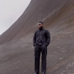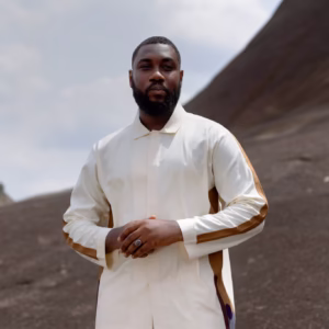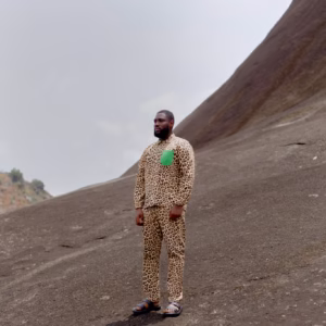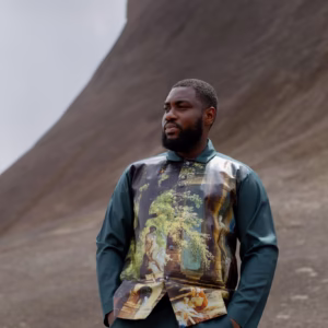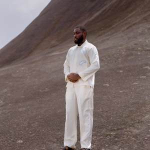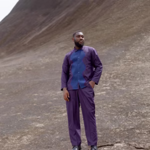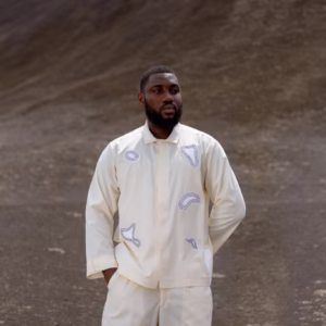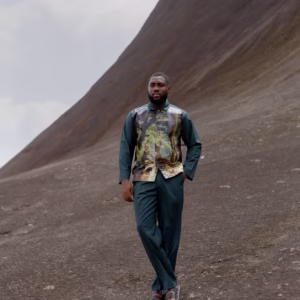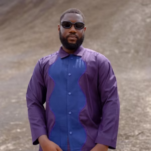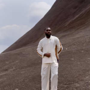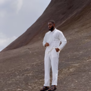 The shirt’s copper-toned buttons provide a metallic contrast, while the clean lines and tailored fit keep it polished yet poetic. Inspired by ceremonial dancers and the symbolism of Sankofa, this look whispers with elegance rather than shouting for attention.